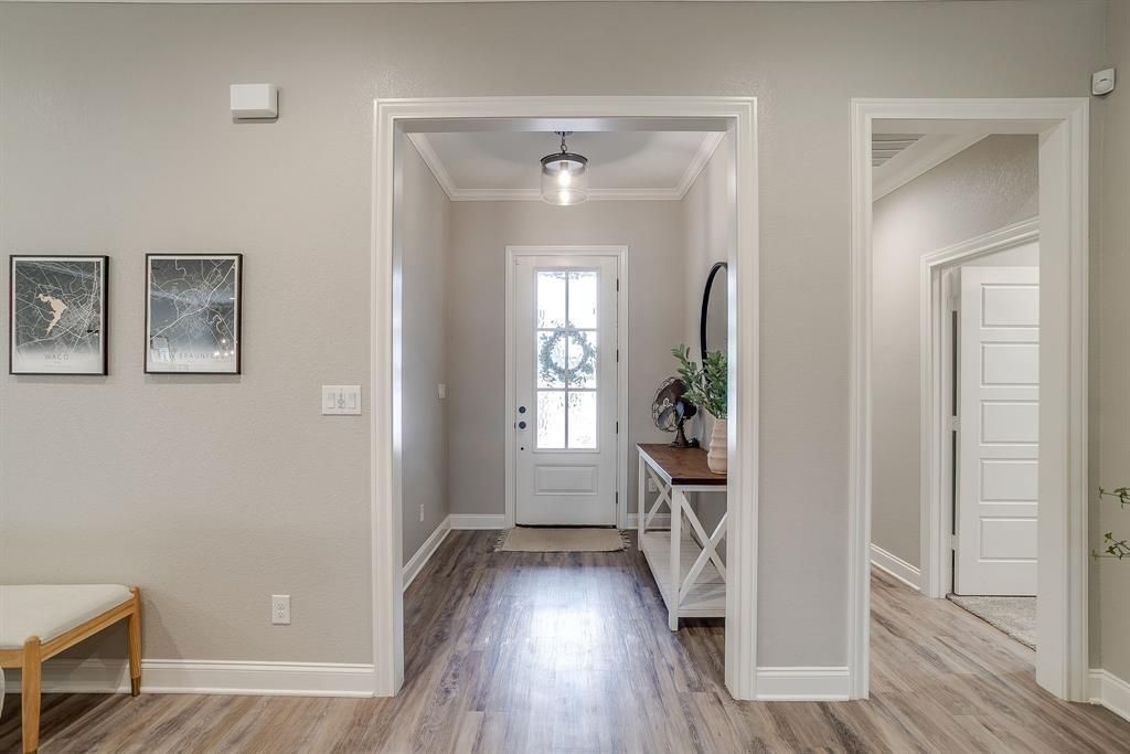 Welcome to this meticulously designed home in the sought-after Moonlight Park neighborhood! Built in 2022, this nearly-new residence combines contemporary style with thoughtful functionality, offering everything you're looking for. Step inside to discover an open-concept floor plan bathed in natural light, featuring beautiful wood-look flooring and designer neutral paint throughout. The heart of the home is a chef's dream kitchen with pristine white cabinetry, stunning quartz countertops, a gorgeous tile backsplash, and a spacious island with seating for four. The smart oven adds modern convenience, while the walk-in pantry and abundant storage ensure everything has its place. The living room centers around an elegant brick fireplace creating a warm gathering space that flows seamlessly into the dining area—perfect for entertaining or everyday family life. A private office nook provides the ideal work-from-home setup. Retreat to your spa-like primary bathroom featuring a freestanding soaking tub, oversized walk-in shower with frameless glass, dual vanities, and modern finishes throughout. The generous walk-in closet offers custom built-ins and convenient additional access directly to the laundry room—a thoughtful touch that makes daily routines easier. The covered back patio with stained ceiling extends your living space outdoors, perfect for Texas evenings. Don't miss this opportunity to own a like-new home with designer finishes and premium features. Schedule your showing today!